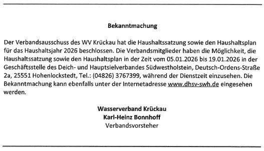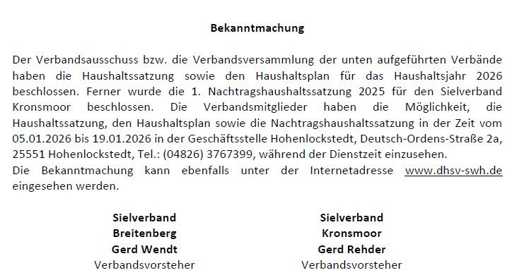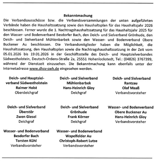 Die Verbandsausschüsse der Wasser- und Bodenverbände Gettorfer-Lindauer-Au, Hörnerau, Padenstedt, Untere Buckener Au, Wapelfelder Au und Wittensee-Exbek haben die Haushaltssatzung sowie den Haushaltsplan für das Haushaltsjahr 2026 beschlossen. Die Verbandsmitglieder haben die Möglichkeit, die Haushaltssatzung und den Haushaltsplan in der Zeit vom 05.01.2026 bis 19.01.2026 in der Geschäftsstelle des Deich- und Hauptsielverbandes Südwestholstein, Deutsch-Ordens-Straße 2a, 25551 Hohenlockstedt, Tel.: (04826) 3767399, während der Dienstzeit einzusehen.